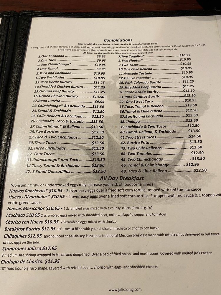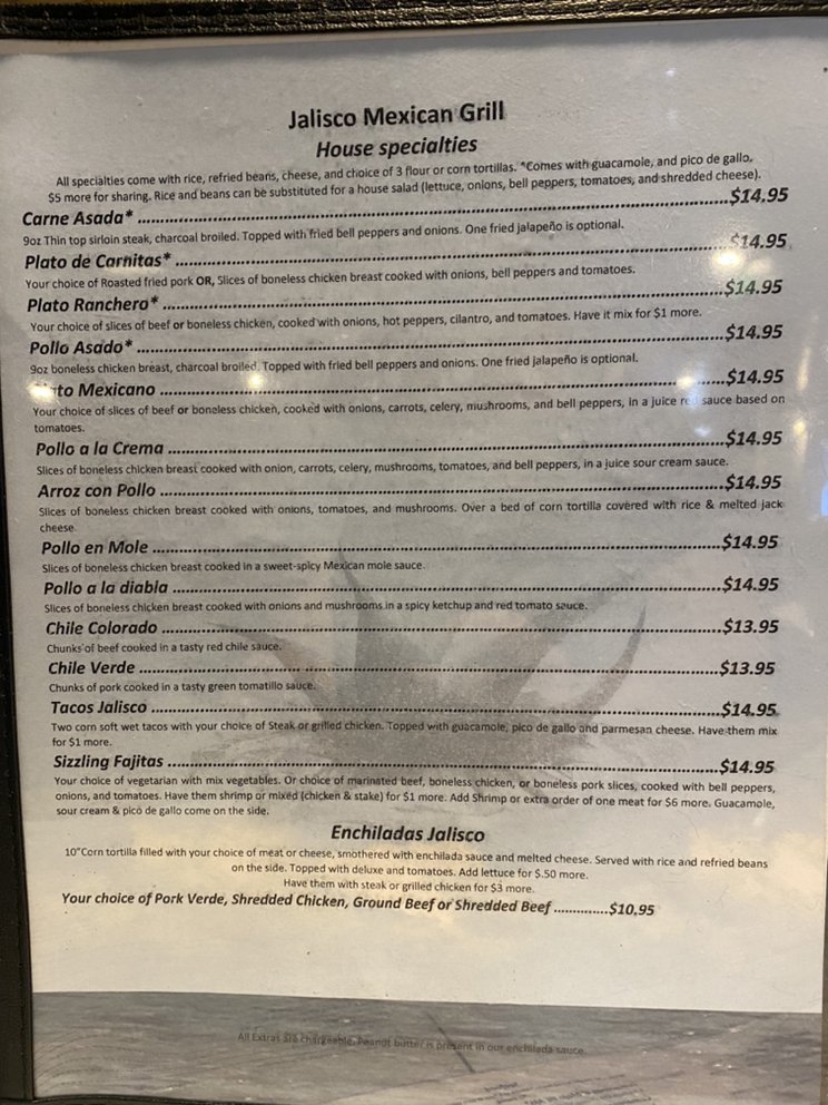 Seafood lovers can savor the Camarones a la Crema, delivering succulent shrimp in a luscious sour cream sauce. With large portions and sizzling flavors, every dish promises to satisfy your hunger. The welcoming atmosphere, combined with attentive service, makes Jalisco a spot for everyone—families, groups, or a casual dining experience. Expect a full bar, outdoor seating, and happy hour specials, ensuring your visit is enjoyable. Dive into the vibrant taste of Mexico without the fancy frills—it’s the authenticity that shines through at Jalisco Mexican Grill.